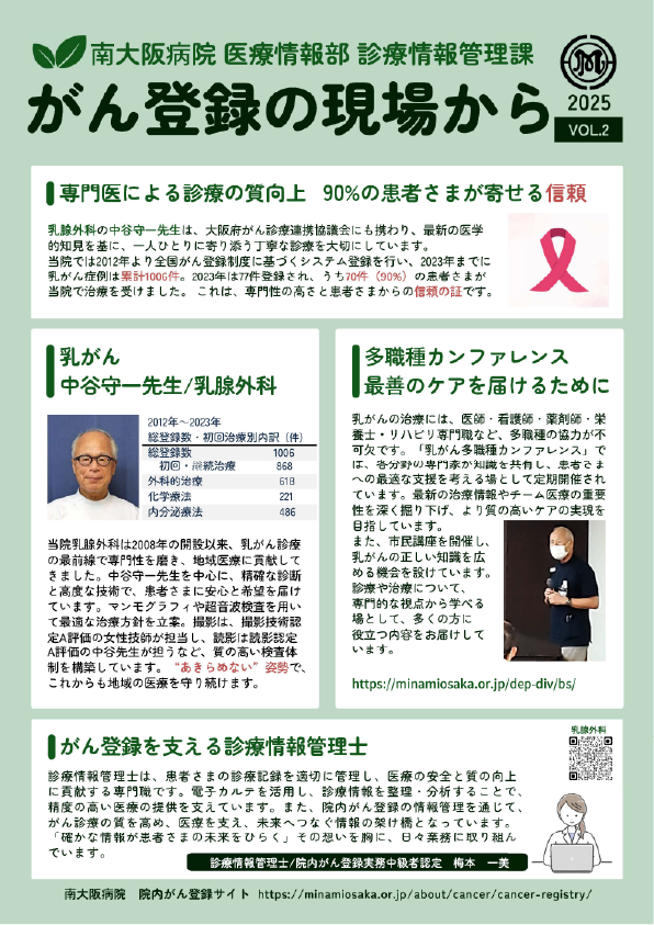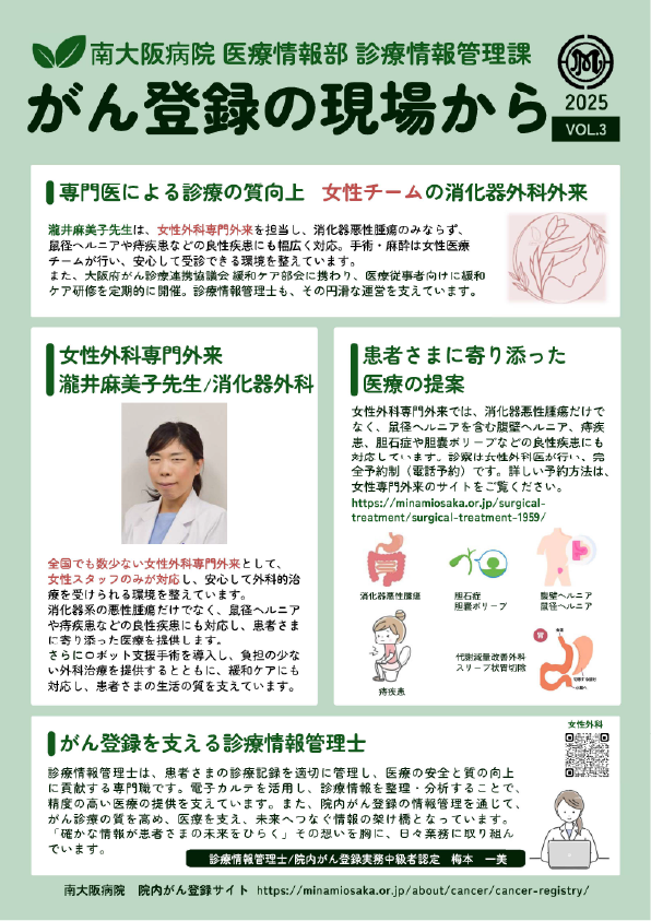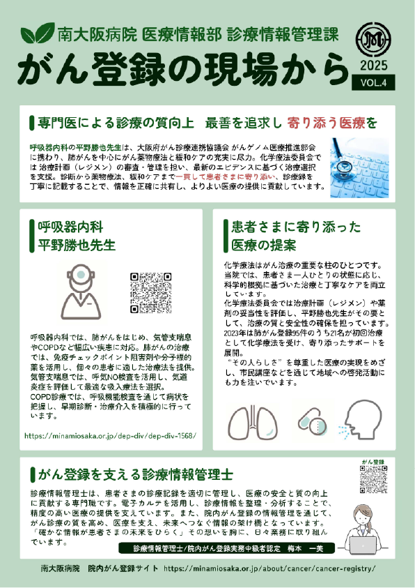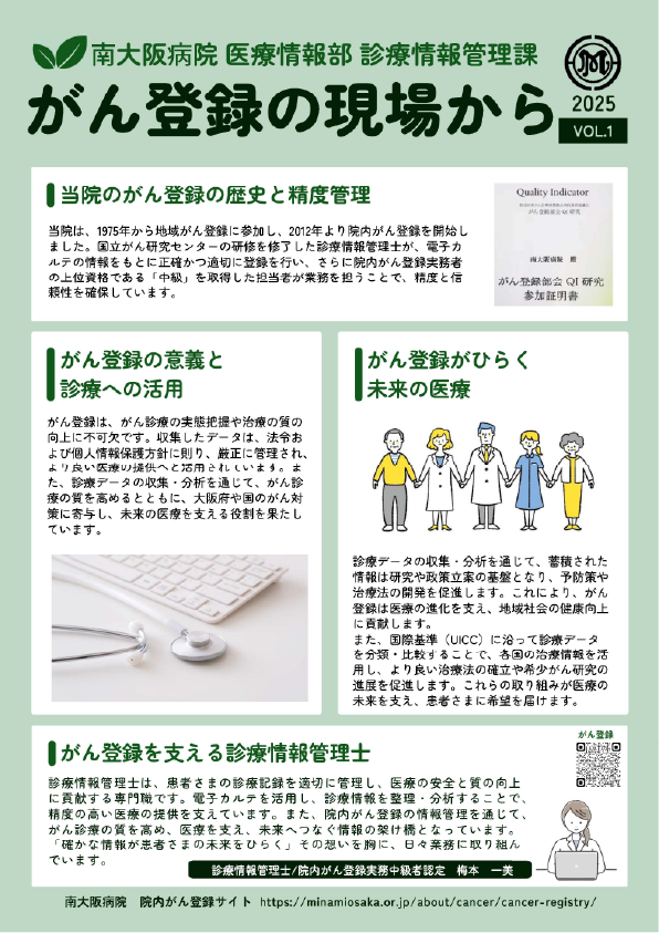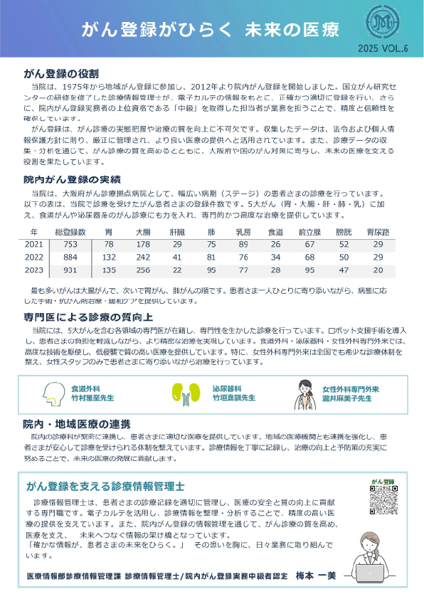 当院は昭和50年1月より大阪府地域がん登録事業に参加し登録しています。今年で50年目になります。大阪府地域がん登録・全国がん登録へ登録することにより、大阪府のがん対策に役立ちます。