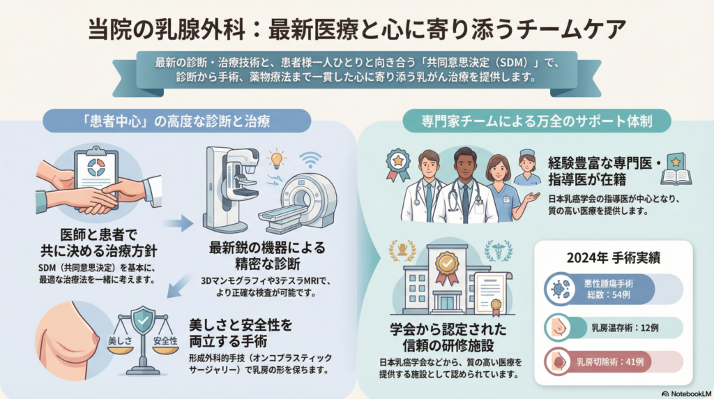 - 地域全体の医療向上: 放射線治療が必要な際の近隣高次医療機関(大阪公立大学医学部附属病院等)とのスムーズな連携維持と、地域全体での質の高い乳がん診療の提供。