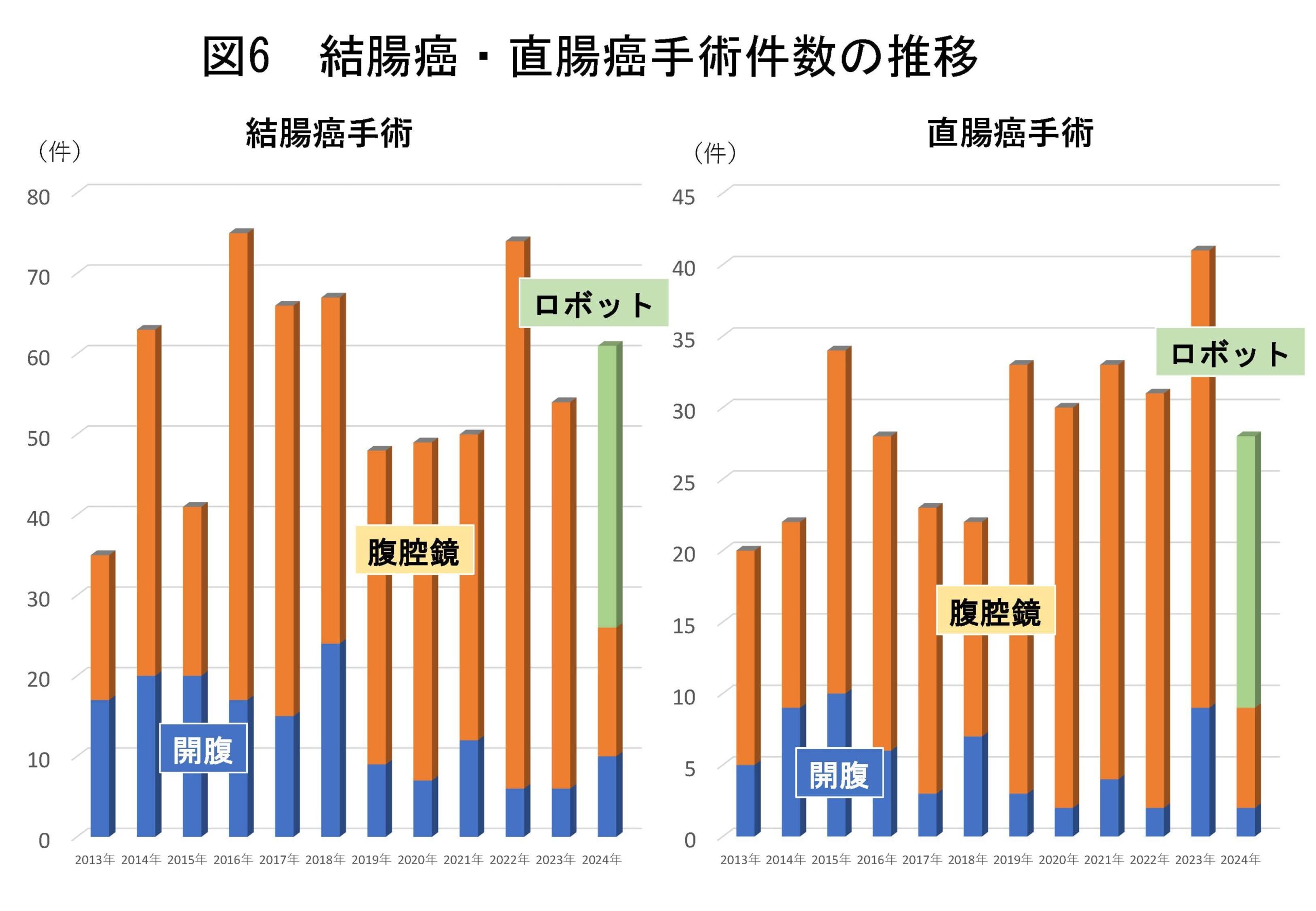 本邦では結腸癌・直腸癌の手術は腹腔鏡手術が主流になっており、当院でも開腹より腹腔鏡手術が多くを占めています。さらに、2024年からは手術支援ロボットDavinci Xiを導入し、2月から結腸癌・直腸癌に対するロボット支援手術を開始しました。今後、腹腔鏡手術の多くがロボット支援手術に置き換わると思われます(図6)。