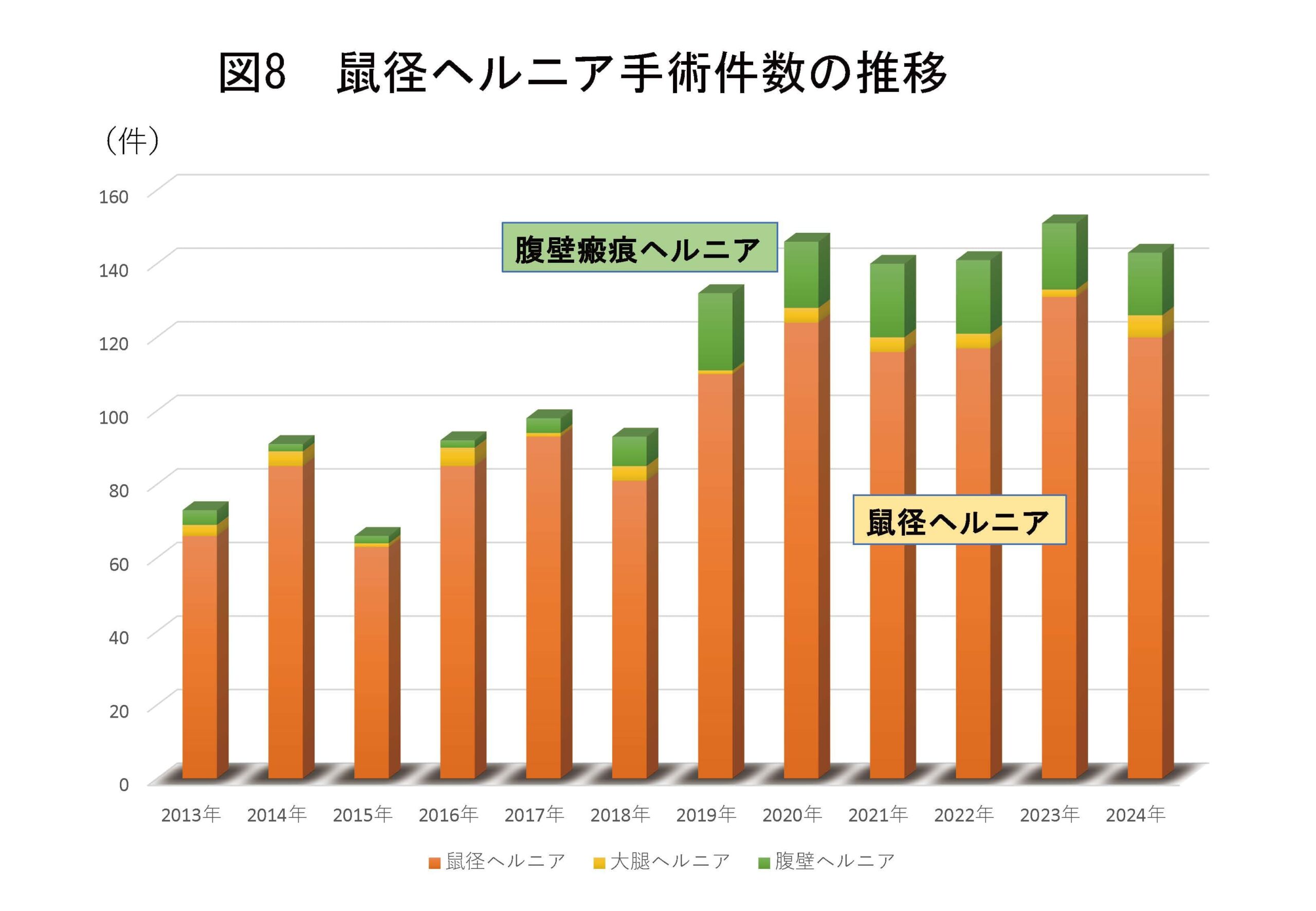 当院では鼠径ヘルニアに対する手術は腹腔鏡手術(TAPP法)を標準手術としています。2014年より腹腔鏡下ヘルニア修復術を導入していますが、2020年には腹腔鏡下鼠径ヘルニア修復術の手術件数は100件を超え、2024年までの5年間にわたり100件以上を維持しています(図8)。また、当院ではその他のヘルニアの手術件数も比較的多く、2024年には大腿ヘルニア:6件・臍ヘルニア:4件・腹壁瘢痕ヘルニア:17件でした。