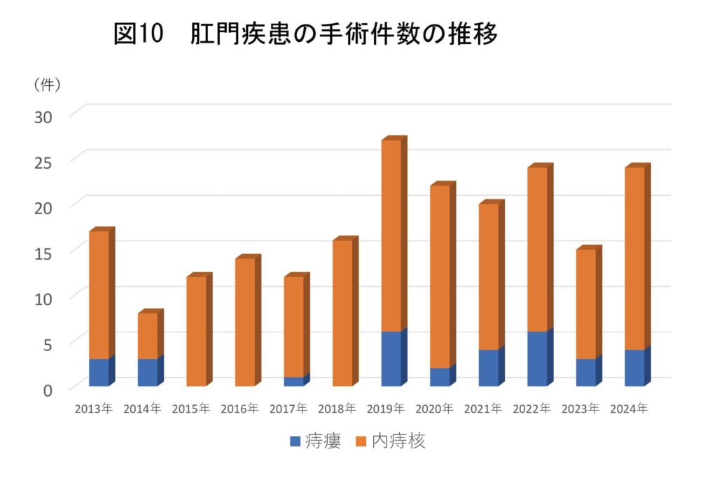 肛門疾患に対する手術は、年間20件程度で推移している。2024年からは、痔核手術が20件で、痔瘻が4件であった。さらに2024年からは硬化療法であるジオン療法を導入している(図10)。