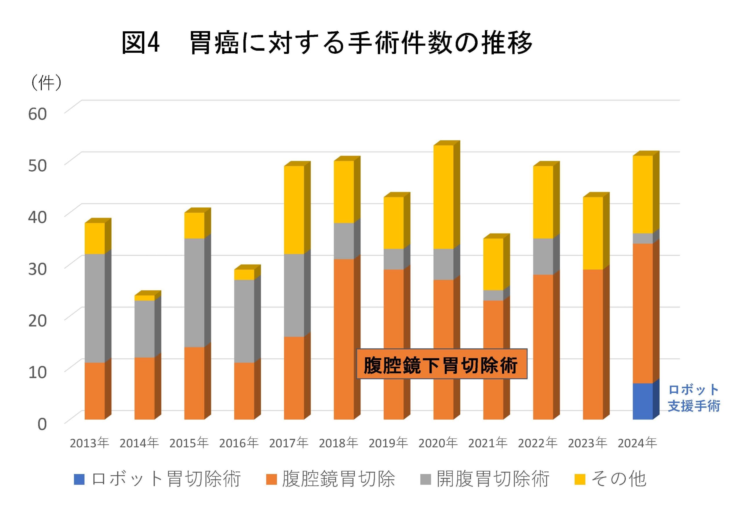 さらに、進行胃癌の進行度診断や抗がん剤治療の効果判定に必須の手技である、審査腹腔鏡手術(その他に含まれている)が胃癌に対する手術の多くを占めるようになっています(図4)。