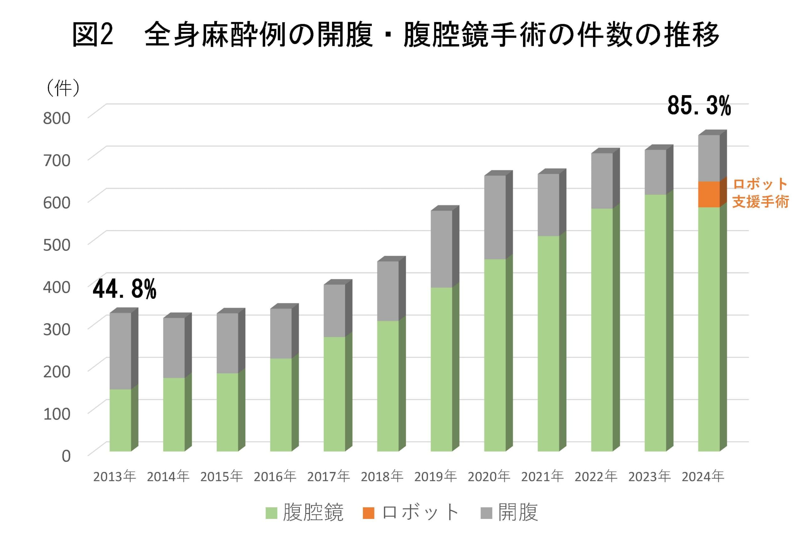 特に近年の腹腔鏡手術の普及に伴い、腹腔鏡手術件数は著しく増加しており、2024年には新規導入となったロボット支援手術61件を含め639件に達しています。全身麻酔下手術に占める腹腔鏡手術の割合は2013年の44.8%から2022年の81.4%、2024年85.3%まで増加しました(図2)。