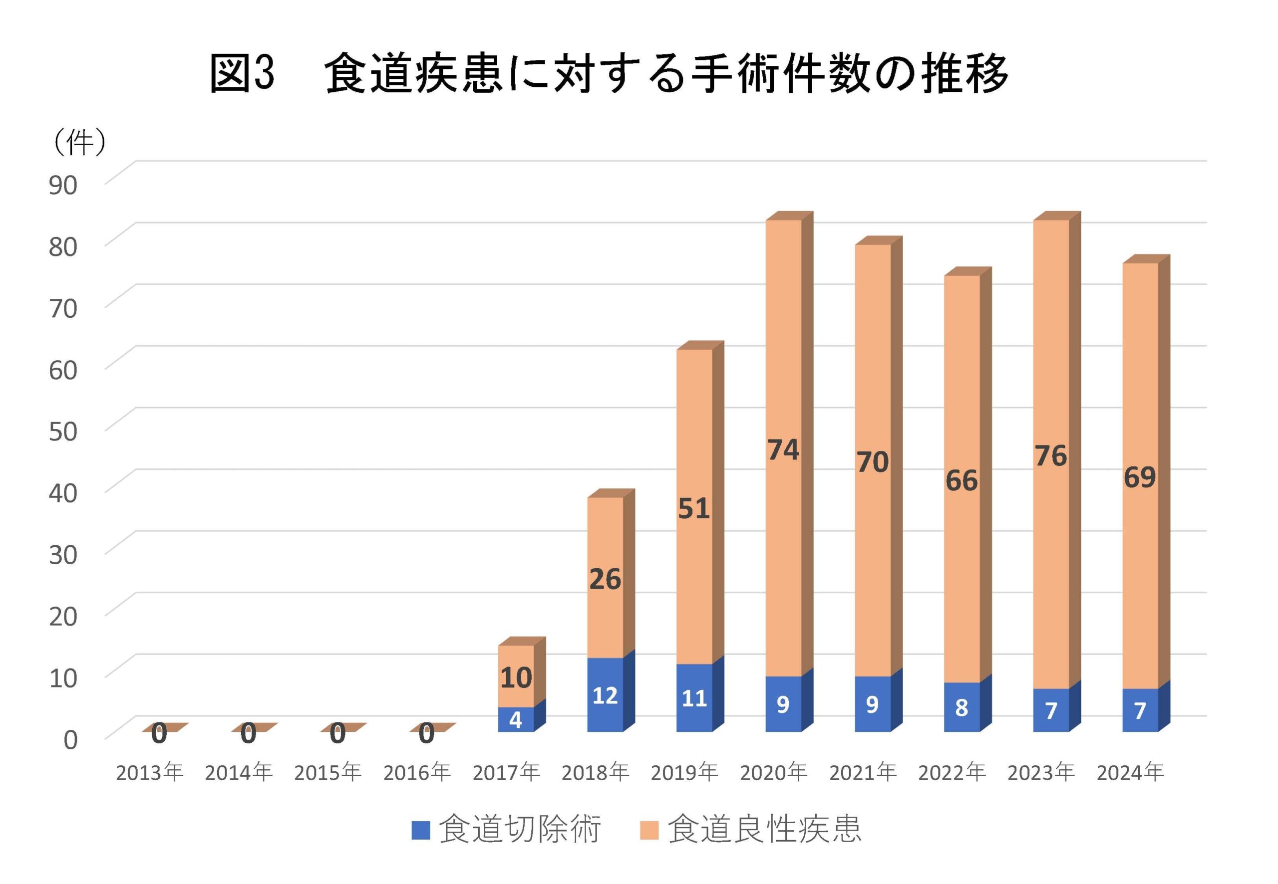 当院外科では食道科認定医・食道外科専門医の常勤により良悪性を問わず食道疾患に対する外科的治療を積極的に行っています。食道癌に対する治療は消化器内科とも連携し、内視鏡的治療が可能な症例は消化器内科で粘膜下層剥離術を施行いただき、外科的治療が必要な症例や抗がん剤治療が適応となる症例は外科で担当しております。外科的治療は胸腔鏡下食道切除術を2017年より導入し、年間10件程度の手術を行っています。食道良性疾患に対する手術も同様に2017年より導入していますが、現在では他の施設には無い当院外科の大きな特徴となっています。食道良性疾患に対する手術は非常に多く、逆流性食道炎や食道裂孔ヘルニアの手術件数では2019年〜2023年の5年連続で日本全国の病院の手術件数の集計で全国最多となりました。2024年の食道良性疾患に対する手術件数は69件で、食道癌に対する手術件数は7件でした(図3)。