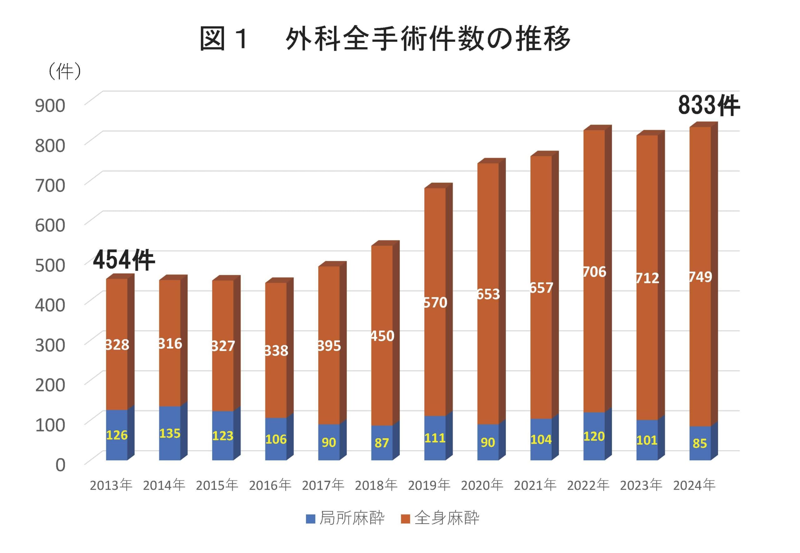 当院の全手術症例数は2016年まで400件後半で推移していましたが、最近の6年間は経時的に増加し、2022年からは800件を超えるようになり2024年の年間症例数は833件になっています(図1)。当院の全手術件数に占める外科の割合は、2024年で30.7%(2715件中833件)を占めています。