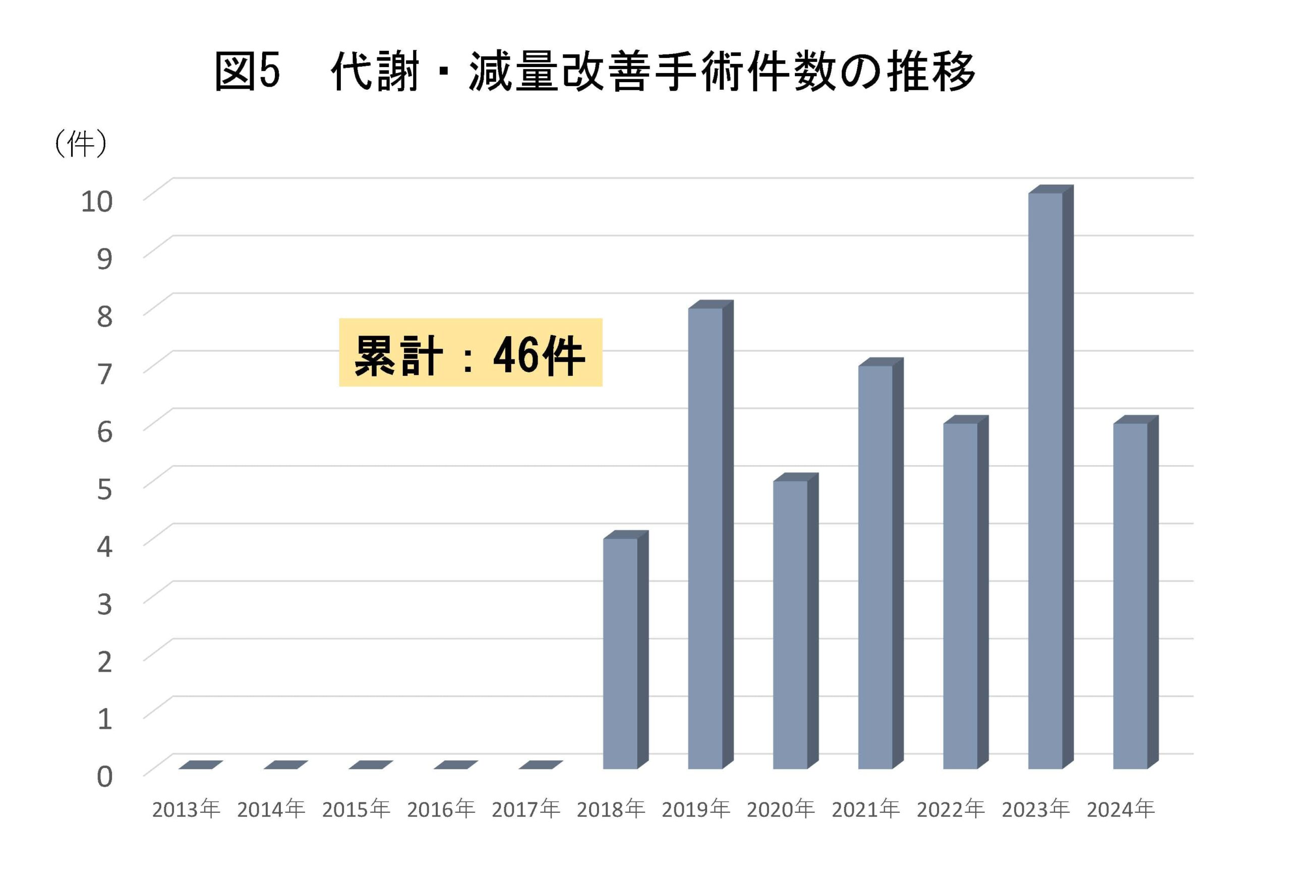 当院では2018年より糖尿病や睡眠時無呼吸症候群・脂質異常症などを合併した高度肥満症(BMI35以上)に対する減量・代謝改善手術を導入しています。減量内科で半年程度の減量指導を行ったのちに手術適応となります。2024年は6件で、これまでの累積で46例に行っています。本邦における肥満人口の増加に伴い、今後増加が期待される手術です(図5)。
