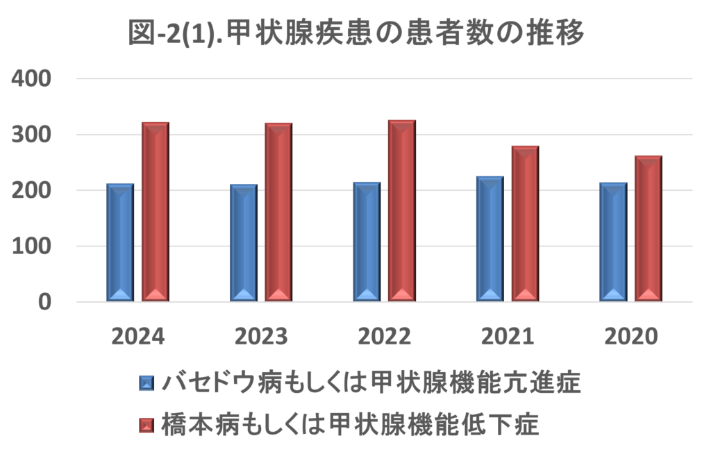 また、甲状腺疾患の患者数の推移では甲状腺機能亢進症(バセドウ病, etc)は200名程度で横ばいに推移していますが、甲状腺機能低下症(橋本病,etc)では増加傾向となっています。これにつきましても人口の高齢化が大きな要因となっていることがうかがえます。