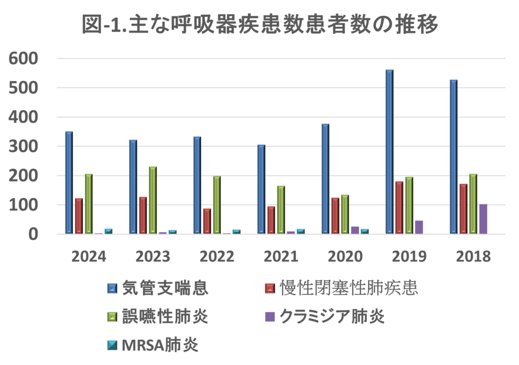 呼吸器疾患数患者数の推移では気管支喘息が最も多くなっていますが、以前から比べたら、約2/3程度に減少しております。慢性閉塞性肺疾患についても、クラミジア肺炎についても減少傾向となっていますが、誤嚥性肺炎はむしろ増加傾向となっており、人口の高齢化が大きな要因となっていることがうかがえます。