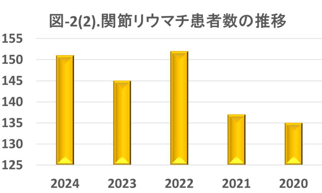 関節リウマチ患者数の推移では年々増加傾向となっており、2024年は2020年に比べ15人の増加となっています。これは当院のリウマチ診療体制が充実していることの結果と考えられます。