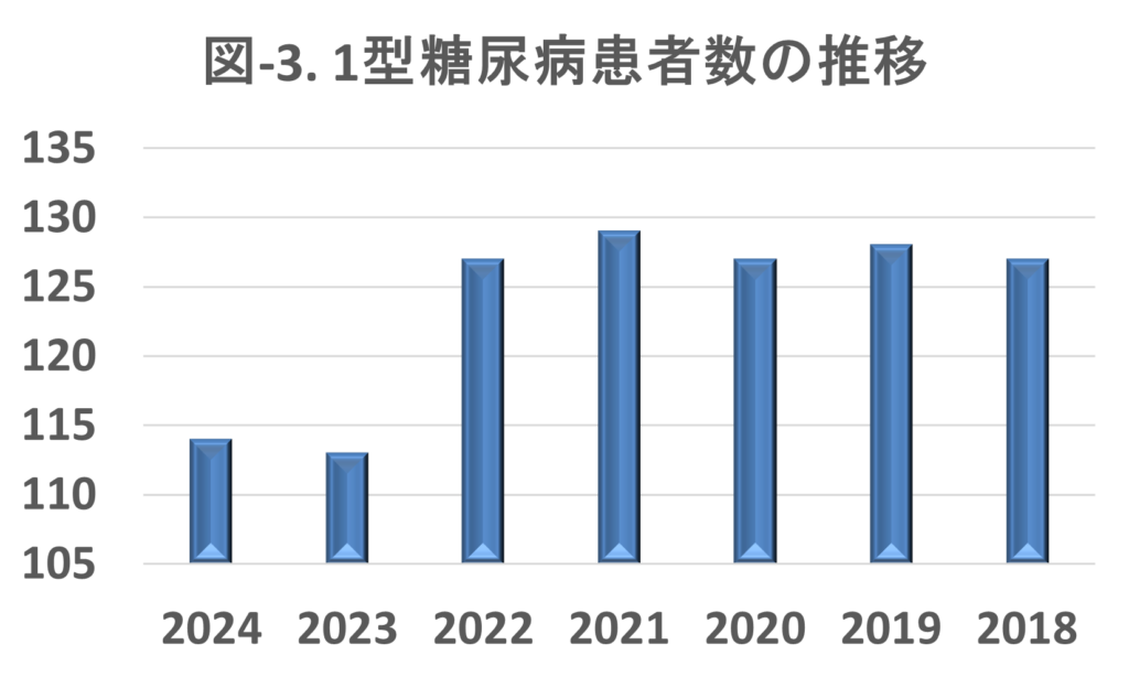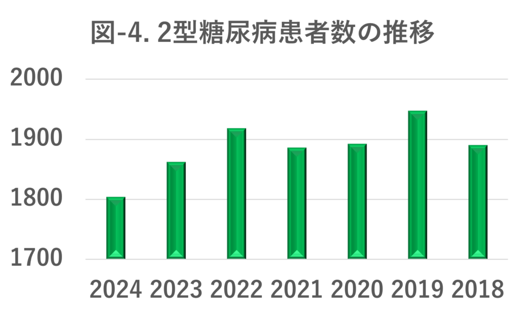 1型糖尿病患者数の推移をお示ししたものですが、2024年は2018年に比べ10程度%減少しています。それでも毎年名以上の1型糖尿病患者さんを診察しています。2型糖尿病患者数の推移では、2024年は2018年に比べ5%程度減少しています。しかし毎年1800名以上の2型糖尿病患者さんが受診されており、他の疾患に比べて格段に多いことがわかります。当院は糖尿病専門病院として、糖尿病診療に力をいれている結果を反映していると思われます。