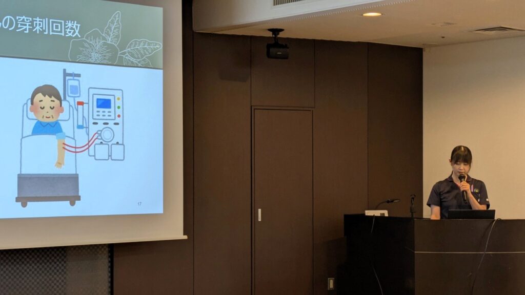 当日は小野内科医院 院長 後藤 清 先生(住之江区医師会 副会長)に座長をお努め頂き、一般演題として透析看護認定看護師の市川 裕美より『エコー下穿刺しますか?しませんか? ~血管の見極め方』と言う演題で、エコーガイド下で透析患者さんの大事なシャント血管を傷つけることなく安全に穿刺する取り組みのご紹介をさせて頂きました。