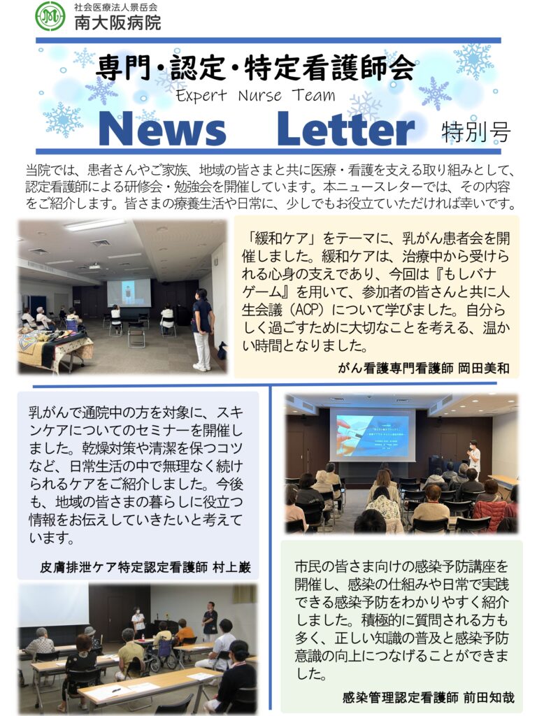 看護部のページの「専門看護師・認定看護師の活動」に 当院の認定看護師の活動を紹介する「専門・認定・特定看護師会 News Letter」を追加しました。