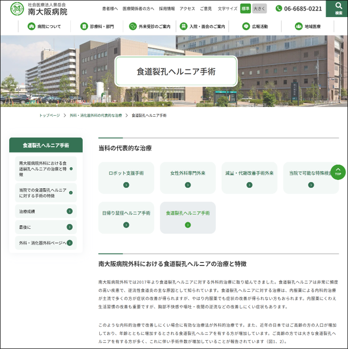 「外科・消化器外科」のページに、当院で行なっている「食道裂孔ヘルニア手術」に関するページを追加しました
